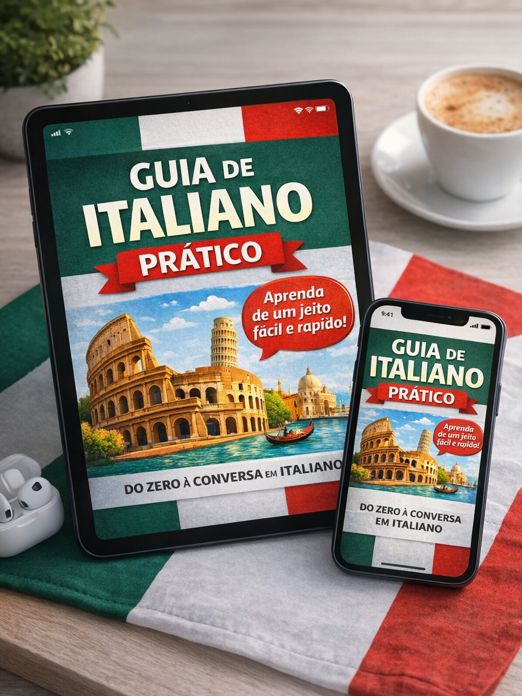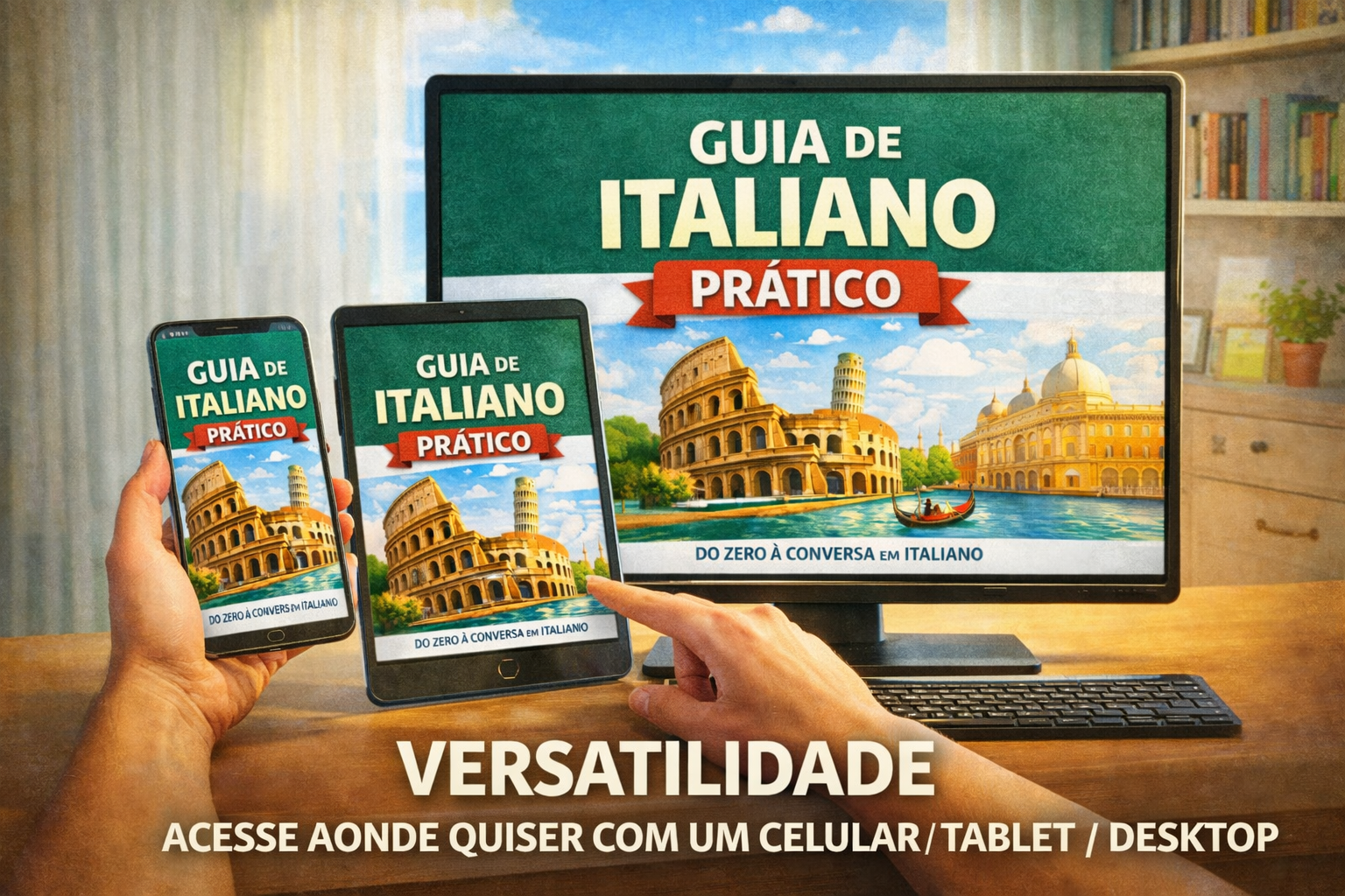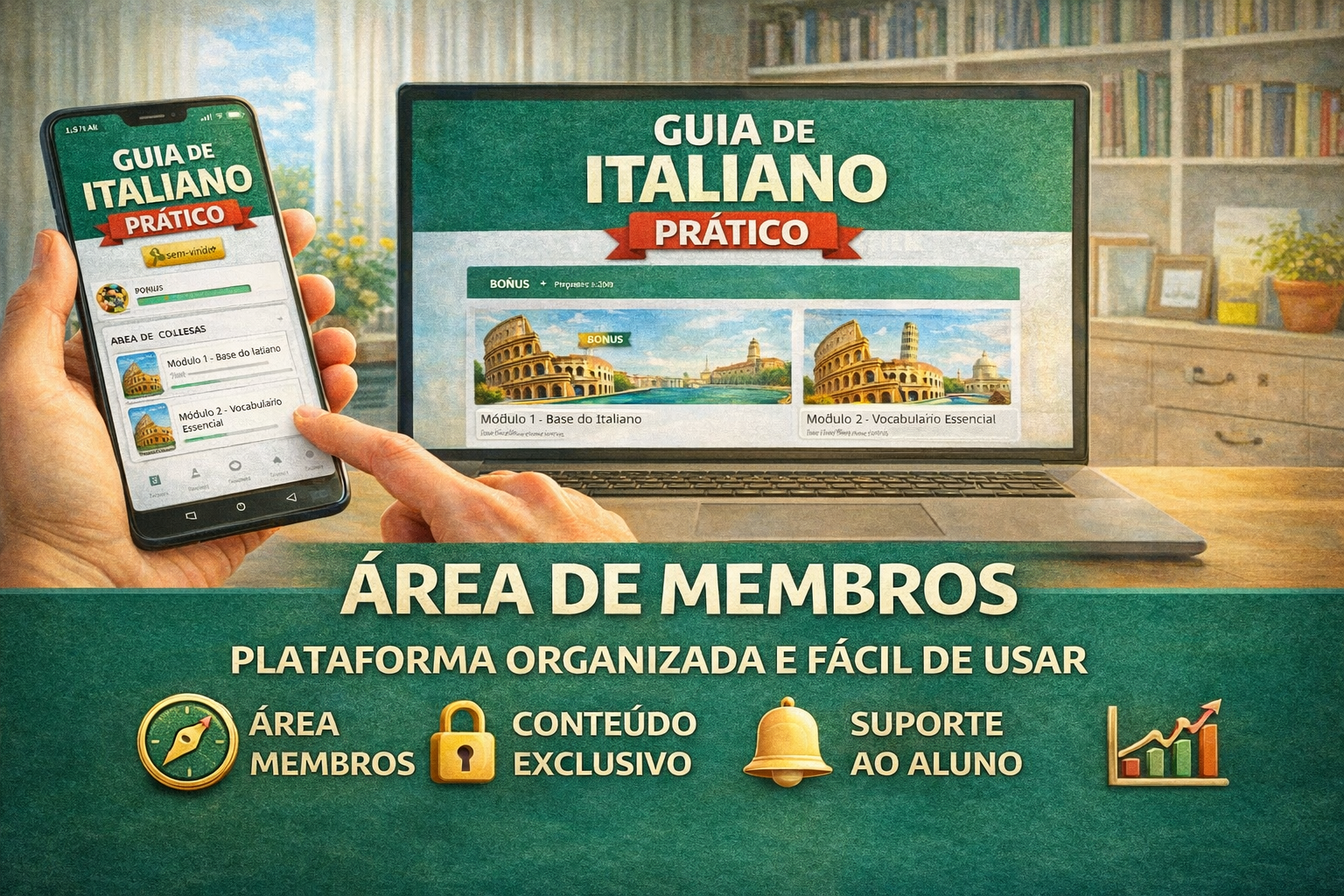 Guia Completo de Italiano + 7 Bônus. Tudo o método que você precisa para destravar e imergir na língua, agora em uma condição imperdível.